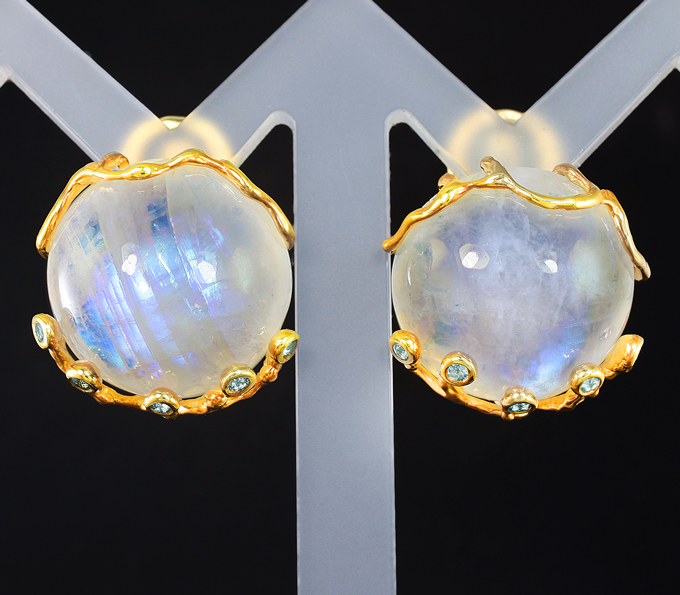 Вашему вниманию предлагаются серьги из стерлингового серебра (925 проба) с лунным камнем и апатитами! Изделие позолочено. Диаметр дополнительной инкрустации 2 мм. Площадка серег 22 х 22 мм. Вес пары 17,9 г. Ниже приводятся ювелирные характеристики вставки.