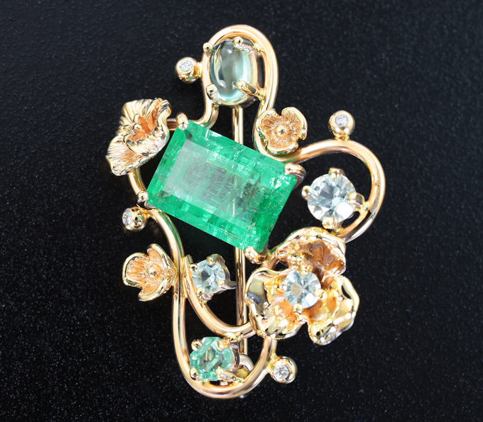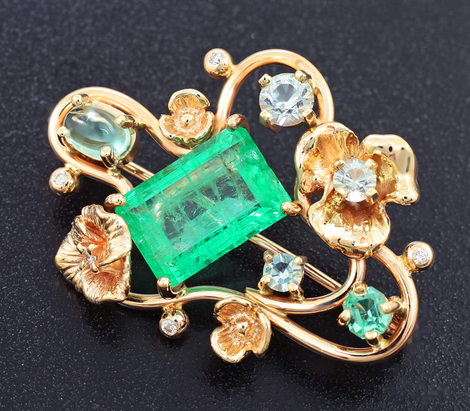 Брошь с изумрудами, аквамарином, бериллом и бриллиантами