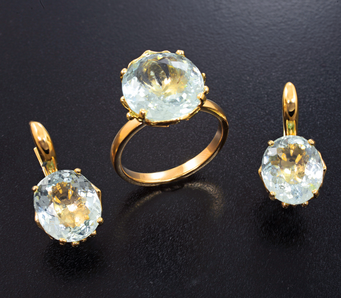 Вашему вниманию предлагается комплект (кольцо + серьги) из желтого золота 585 пробы с аквамаринами 16,9 карата! Размеры вставок 12 х 10 мм и 14 х 13 мм. Вес комплекта 11,5 г.