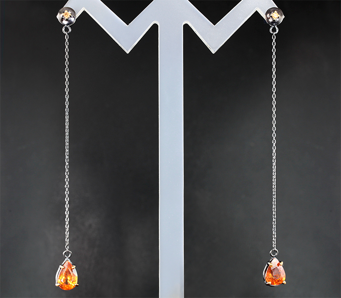 Вашему вниманию предлагаются серьги из стерлингового серебра (925 проба) со спессартинами «фанта» и оранжевыми сапфирами! Изделие с чернением и позолотой. Диаметр дополнительной инкрустации 2 мм. Площадка серег 88 х 7 мм. Вес пары 3,3 г. Ниже приводятся ювелирные характеристики вставок.