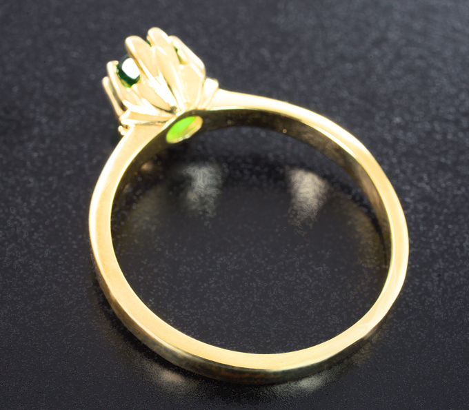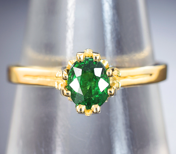 Вашему вниманию предлагается кольцо из желтого золота 585 пробы с цаворитом гранатом! Площадка 7 х 6 мм, высота 6 мм. Вес изделия 2,8 г. Размер 17,5. Ниже приводятся ювелирные характеристики вставки.