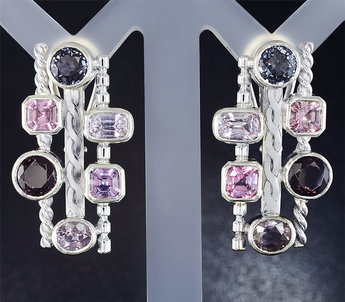 Вашему вниманию предлагаются серьги из стерлингового серебра (925 проба) с разноцветными шпинелями 10,01 карата! Размеры вставок от 4 х 4 мм до 6 мм. Площадка серег 30 х 17 мм. Вес пары 11,8 г.