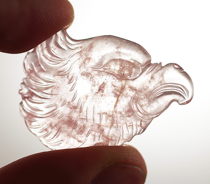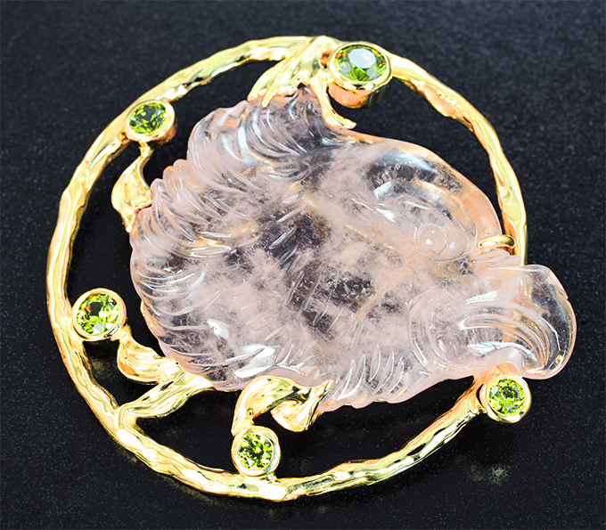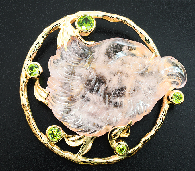 Брошь с миниатюрой «Гриф» из цельного морганита 31,66 карата и уральскими демантоидами 1,05 карата