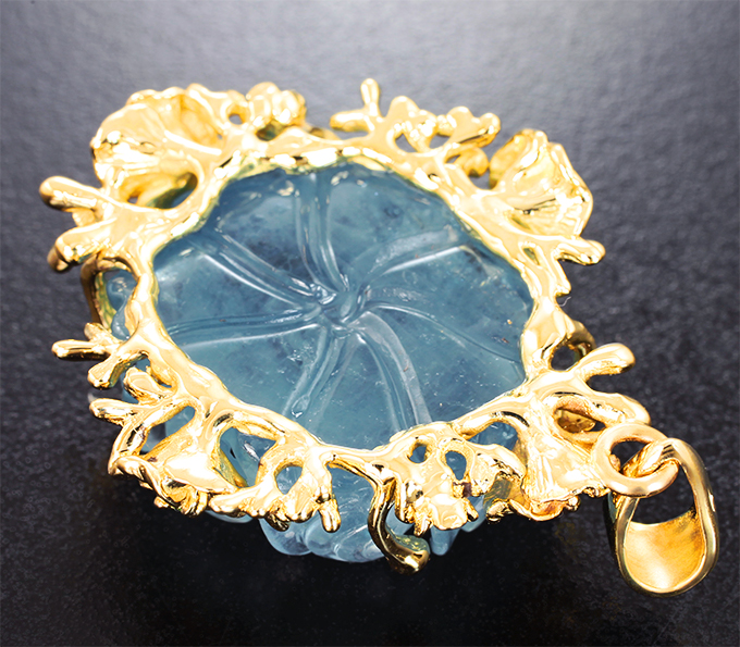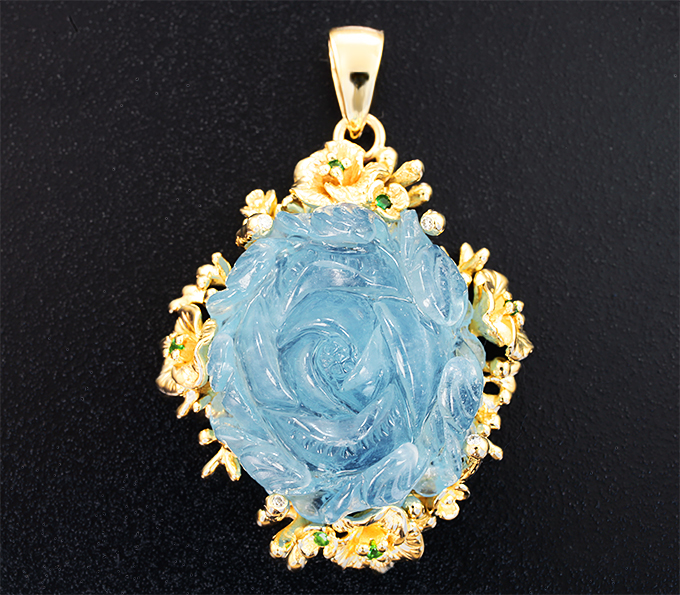 Кулон с резным аквамарином 34,55 карата, цаворитами и бриллиантами