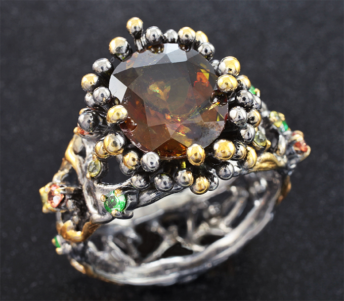 Кольцо с крупным сфеном 4,15 карата, цаворитами, желтыми и оранжевыми сапфирами
