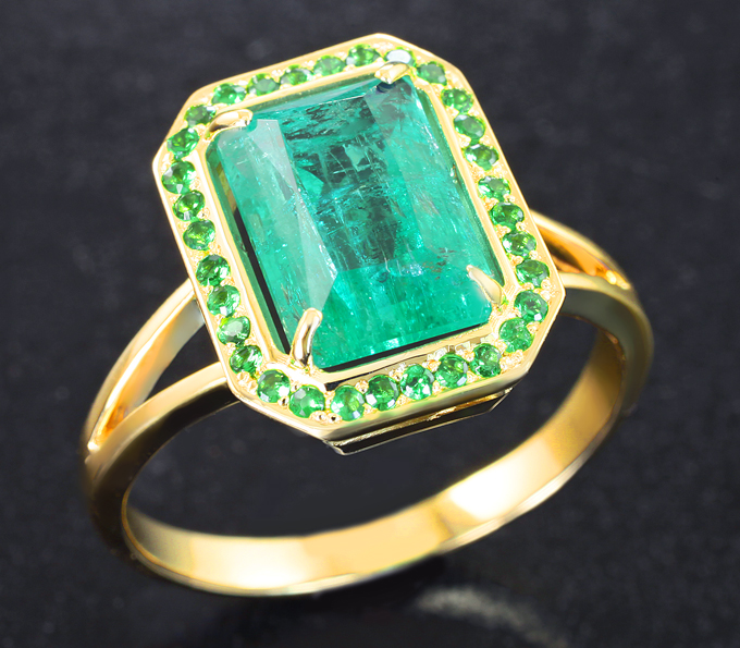 Кольцо с уральским изумрудом 3,14 карата и цаворитами