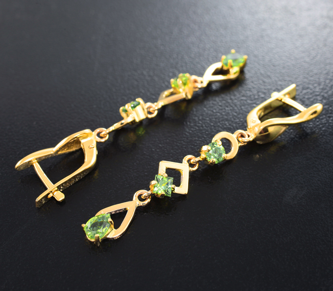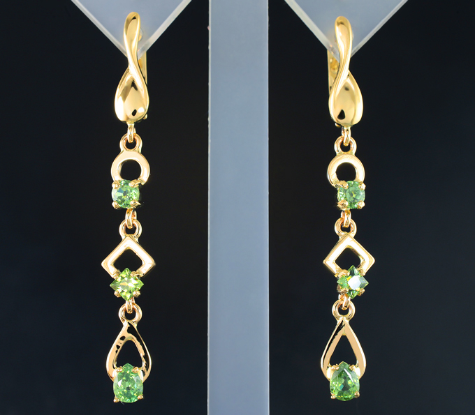 Вашему вниманию предлагаются серьги из желтого золота 585 пробы с демантоидами гранатами! Размеры серег с петлей 50 х 6 мм. Вес пары 5,49 г. Ниже приводятся ювелирные характеристики вставок.