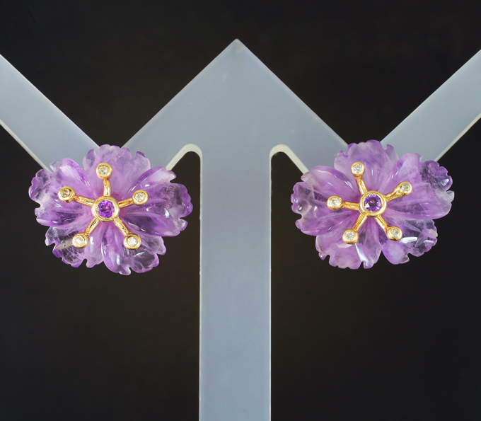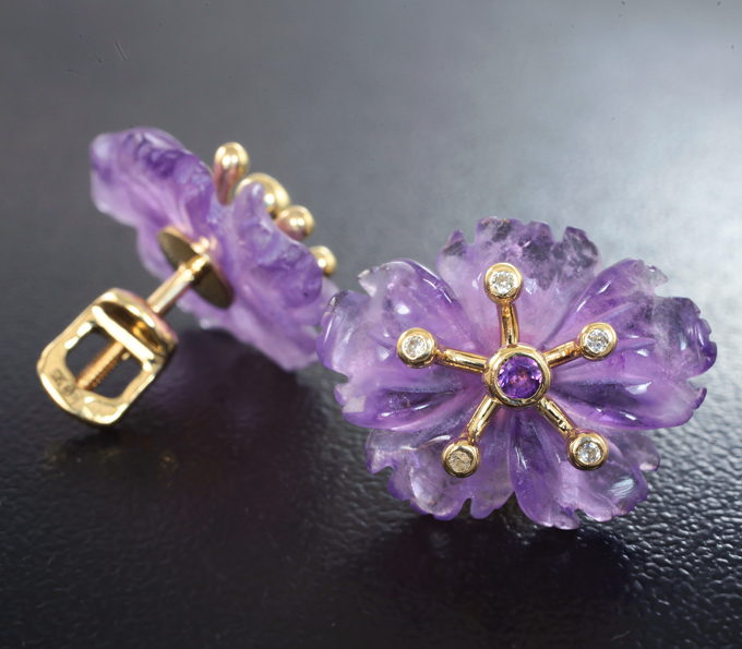 Серьги с резными аметистами 9,23 карата, ограненными аметистами и бесцветными цирконами