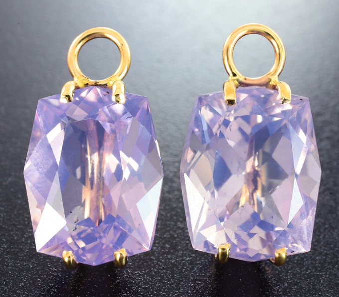 Вашему вниманию предлагаются подвесы для серег из желтого золота 585 пробы с лавандовыми аметистами 26,54 карата! Размеры вставок 17 х 13 мм. Размеры изделия 23 х 13 мм. Вес пары 7,23 г.