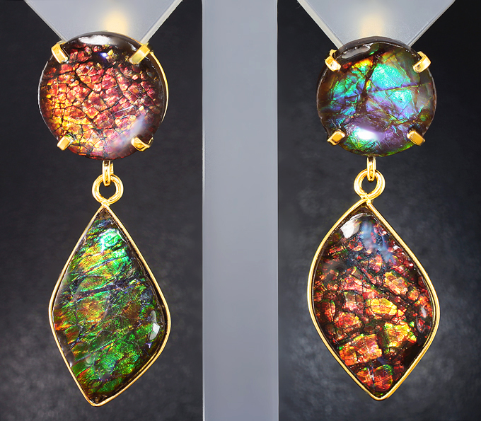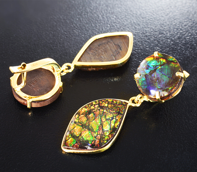 Вашему вниманию предлагаются серьги из желтого золота 585 пробы с аммолитом аммонита! Площадка серег 39 х 14 мм. Вес пары 7,35 г. Ниже приводятся ювелирные характеристики вставок.