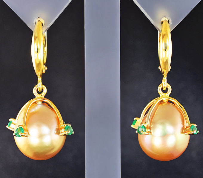 Серьги с золотистым жемчугом 23,84 карата и изумрудами