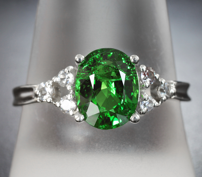Кольцо с цаворитом 2 карата и бесцветными сапфирами