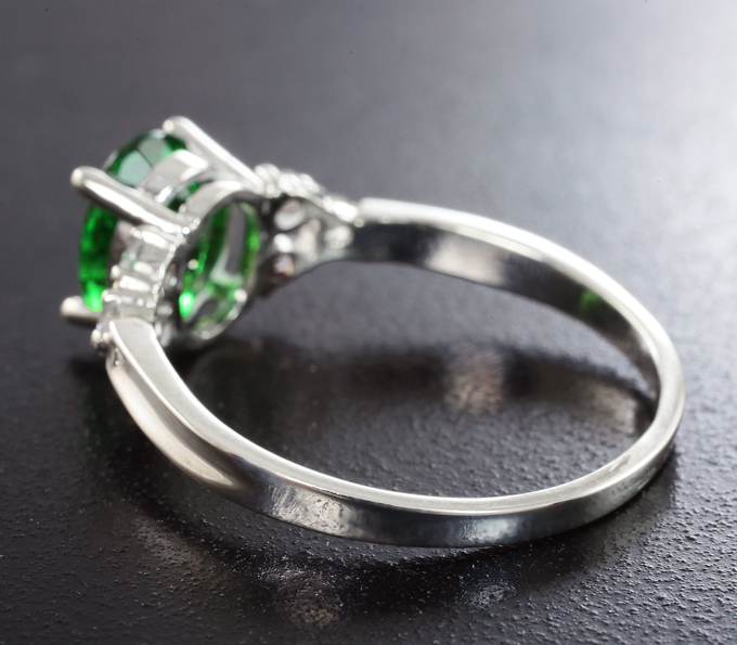 Вашему вниманию предлагается кольцо из стерлингового серебра (925 проба) c цаворитом гранатом и бесцветными сапфирами! Диаметр дополнительной инкрустации 2 мм. Площадка 15 х 8 мм, высота 6 мм. Вес изделия 2,29 г. Размер 19. Ниже приводятся ювелирные характеристики цаворита.