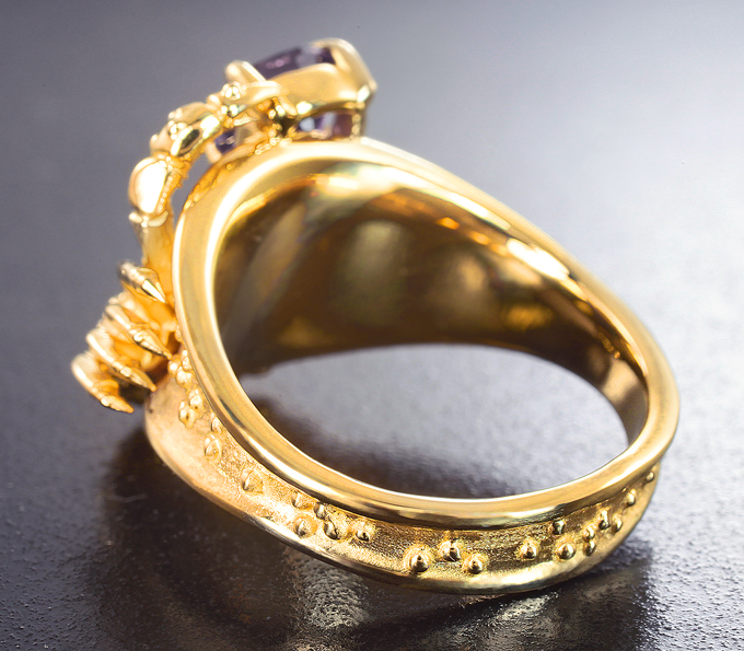 Вашему вниманию предлагается кольцо из желтого золота 585 пробы с сапфиром топовой огранки со сменой цвета! Площадка 17 х 17 мм, высота 6 мм. Вес изделия 9,2 г. Размер 16,75. Ниже приводятся ювелирные характеристики вставки.