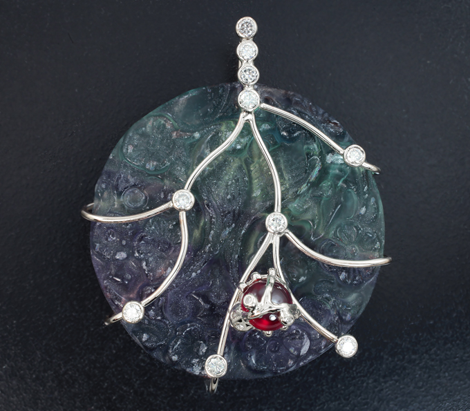 Кулон с резным многоцветным флюоритом 101,09 карата, кабошоном рубина 2,39 карата, муассанитами и бесцветными цирконами