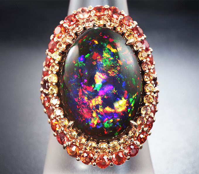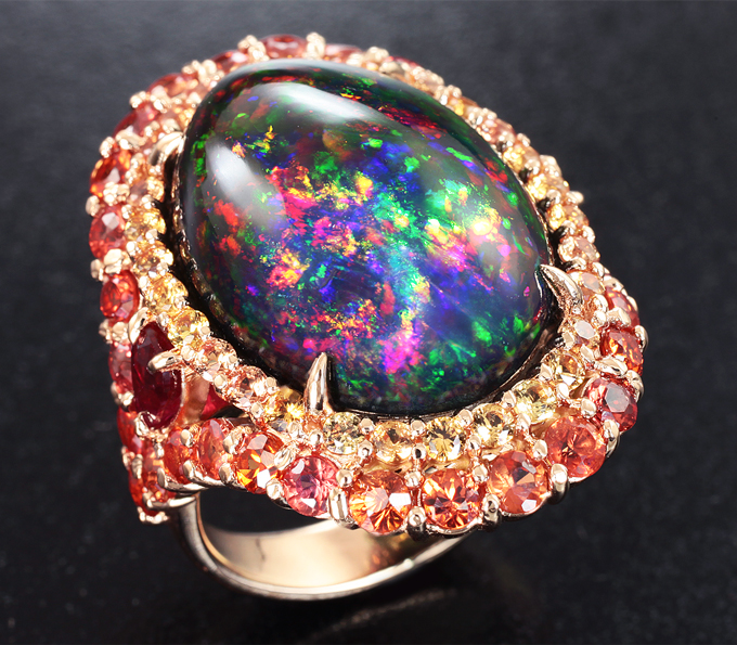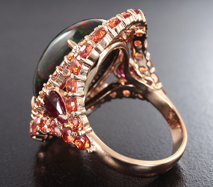 Кольцо с кристаллическим черным опалом 9,98 карата, рубинами, оранжевыми и желтыми сапфирами