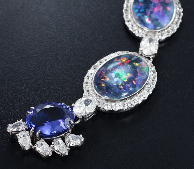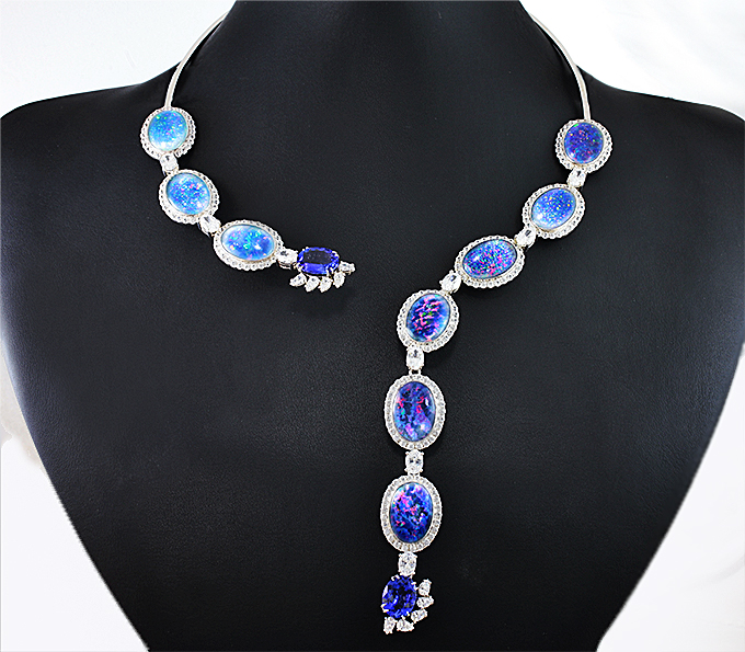Колье с австралийскими триплет опалами 62,96 карата, чистейшими танзанитами, муассанитами, и бесцветными цирконами