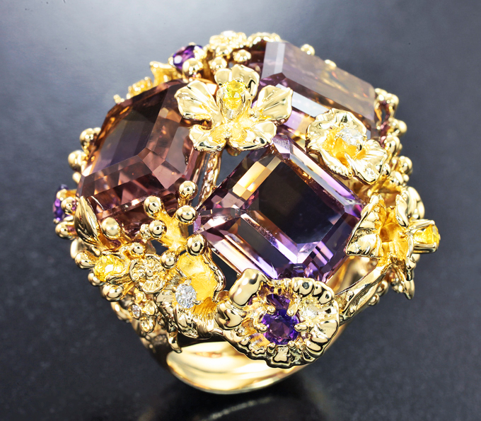Кольцо с резными аметринами 29,36 карата, аметистами, желтыми сапфирами и бриллиантами