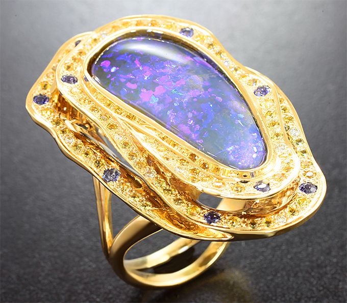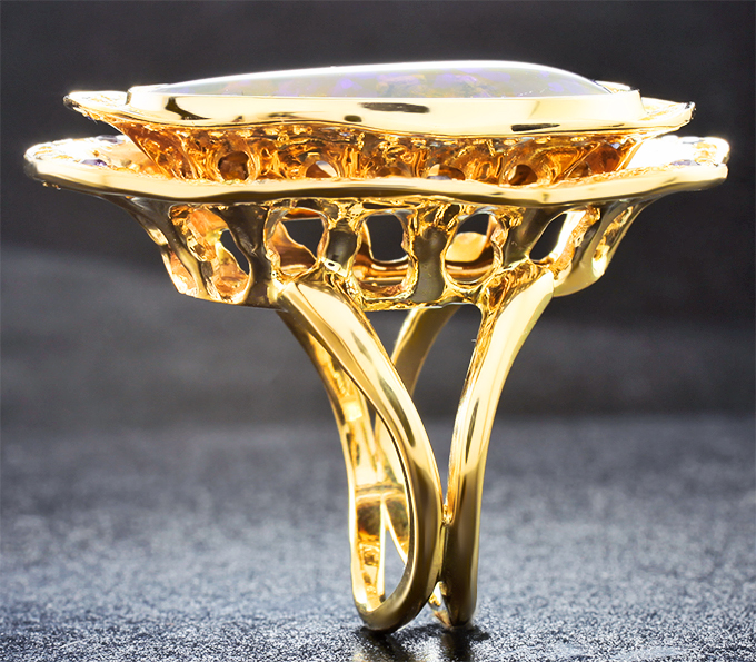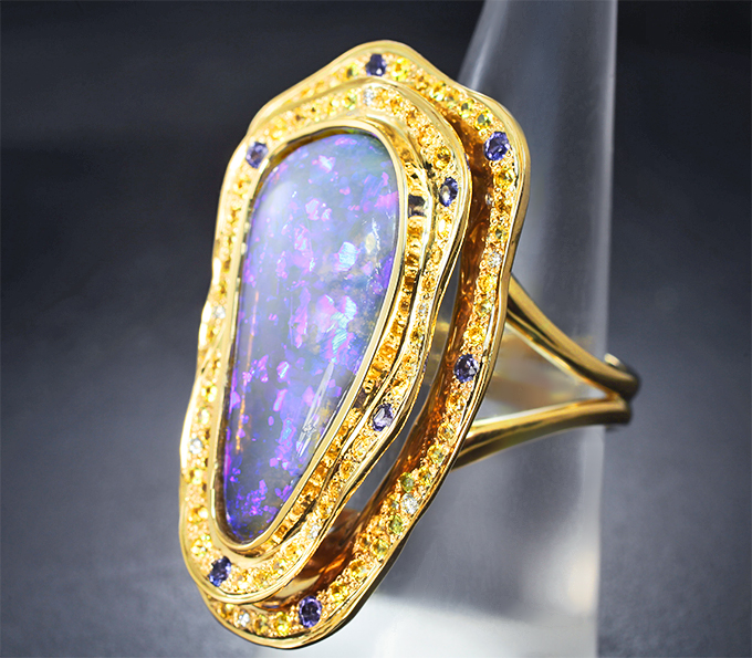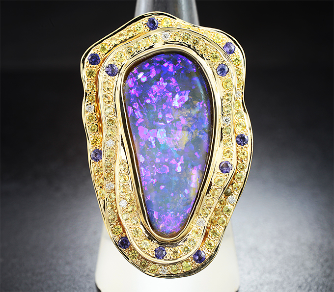 Вашему вниманию предлагается кольцо из желтого золота 585 пробы с крупным австралийским черным опалом, фиолетовыми и желтыми сапфирами, а также брилиантами! Основные цвета опалесценции: фиолетовый, синий и зеленый. Диаметр дополнительной инкрустации от 1,25 мм до 2 мм. Площадка 40 х 26 мм, высота 12 мм. Вес изделия 22,4 г. Размер 18,25. Ниже приводятся ювелирные характеристики опала.