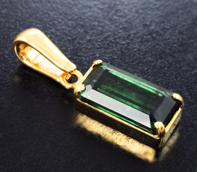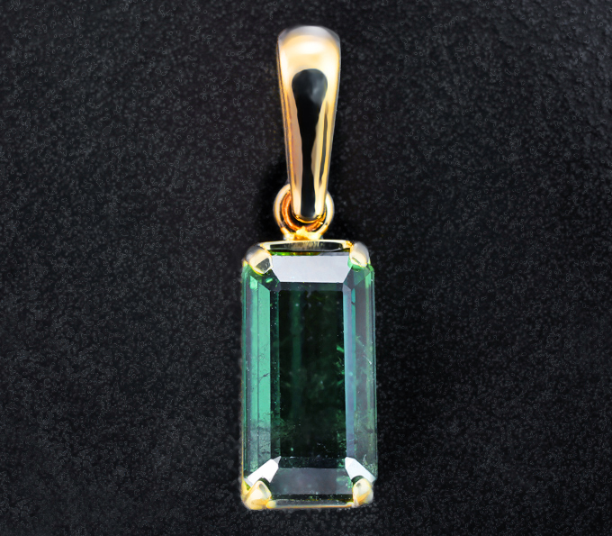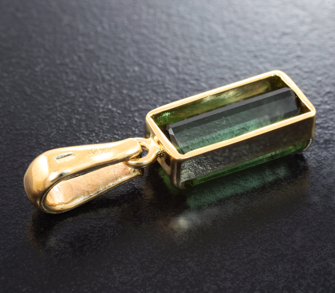 Вашему вниманию предлагается кулон из желтого золота 585 пробы с зеленым турмалином! Размеры кулона с петлей 23 х 6,5 мм. Вес изделия 1,84 г. Ниже приводятся ювелирные характеристики вставки.