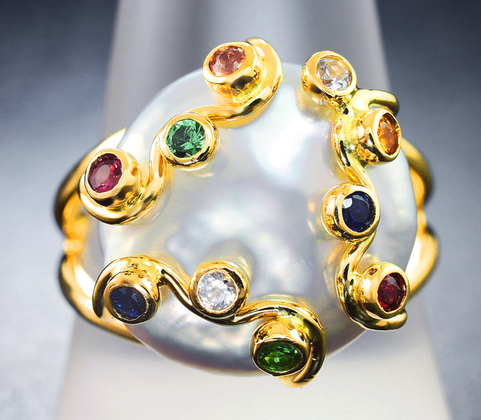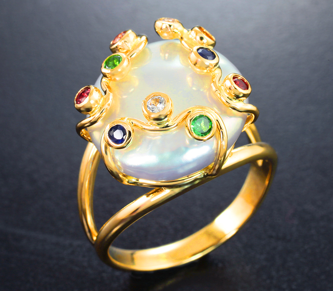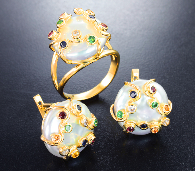 Вашему вниманию предлагается комплект (кольцо + серьги) из желтого золота 585 пробы с жемчугом барокко 35,89 карата, цаворитами гранатми и разноцветными сапфирами! Размеры вставок от 2 мм до 16 х 16 мм. Вес комплекта 18,6 г.