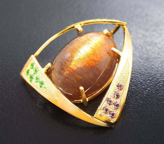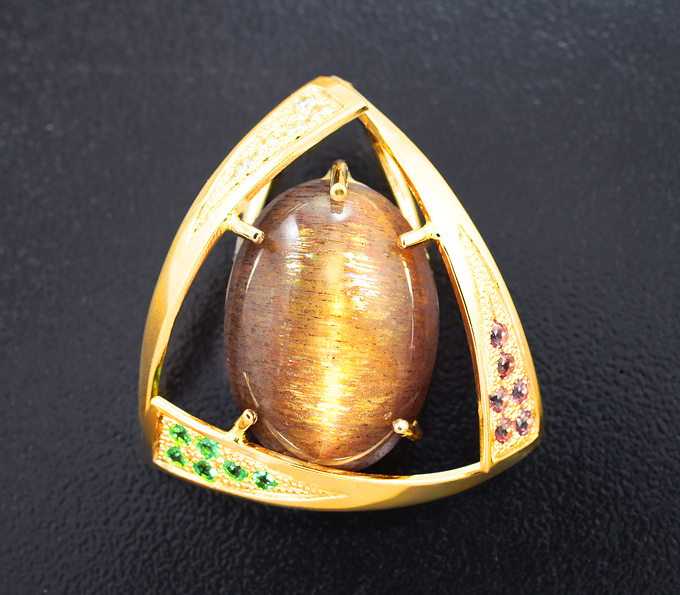 Кулон с солнечным камнем с эффектом кошачьего глаза 15,03 карата, сапфирами, цаворитами гранатами и бриллиантами