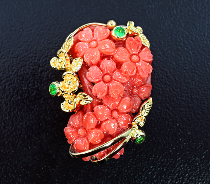 Брошь/кулон с резным кораллом 13,94 карата и цаворитами