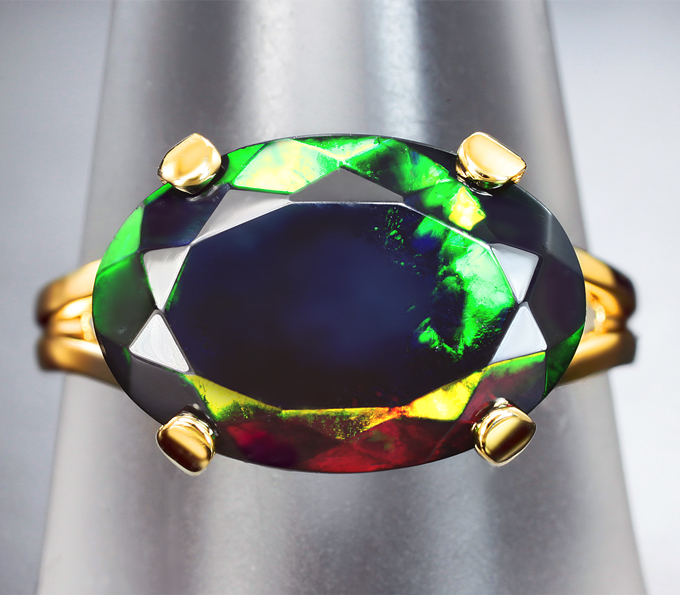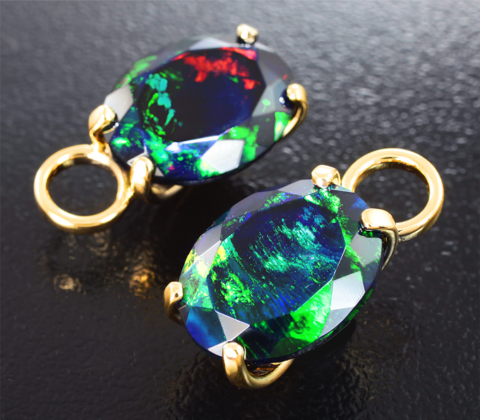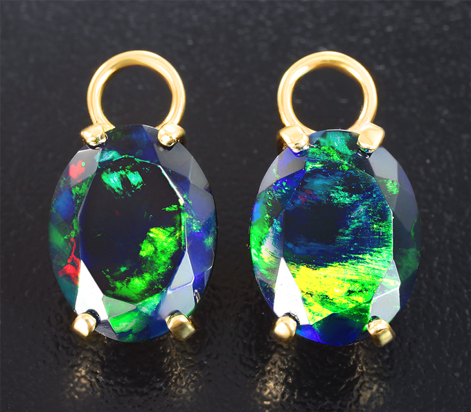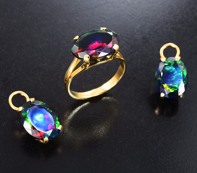Вашему вниманию предлагается комплект (кольцо + подвесы для серег) из желтого золота 750 пробы с ограненными черными опалами 10,93 карата! Основные цвета опалесценции: красный, желтый и зеленый. Размеры вставок 13 х 10 мм и 14 х 10 мм. Вес комплекта 6,74 г.