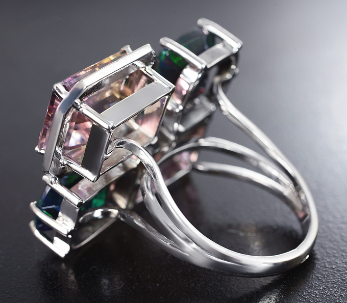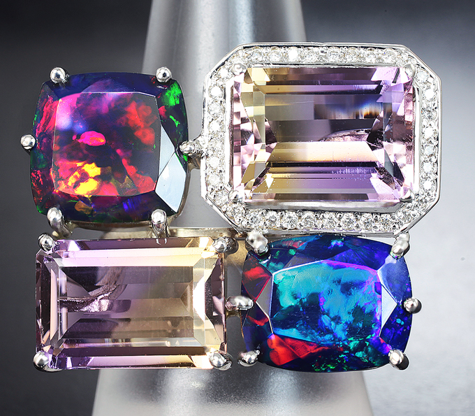 Кольцо с контрастными аметринами 10,33 карата, ограненными черными опалами 5,45 карата и бриллиантами