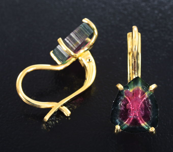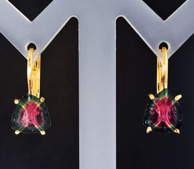 Вашему вниманию предлагаются серьги из желтого золота 585 пробы с контрастными слайсами арбузных турмалинов! Размеры серег с петлей 19 х 8 мм. Вес пары 2,77 г. Ниже приводятся ювелирные характеристики вставок.