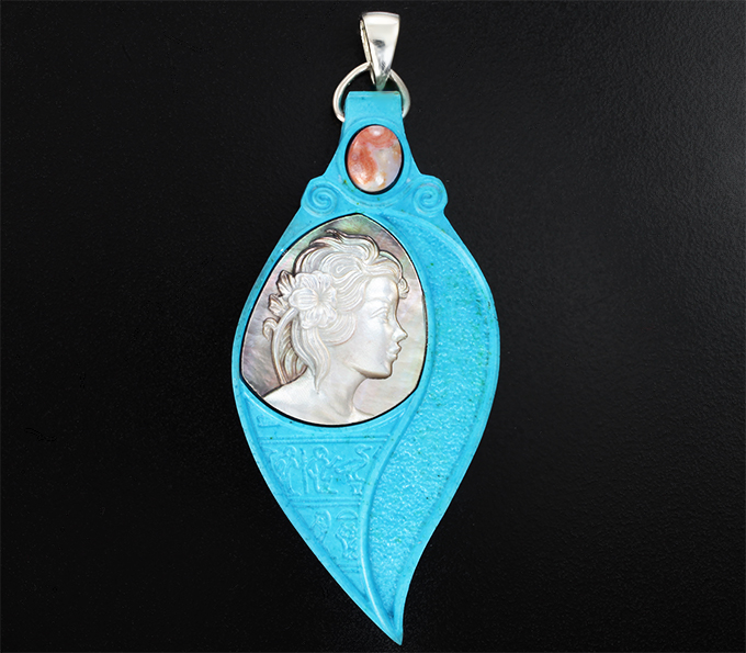 Вашему вниманию предлагается замечательный образец камнерезного искусства – камея-подвеска «Хатхор» из бирюзы с перламутром и яшмой на петле из стерлингового серебра (925 проба)! Ручная работа! Не подвергалась окрашиванию. Размеры с петлей 70 х 29 х 7 мм. Вес 14,1 г.