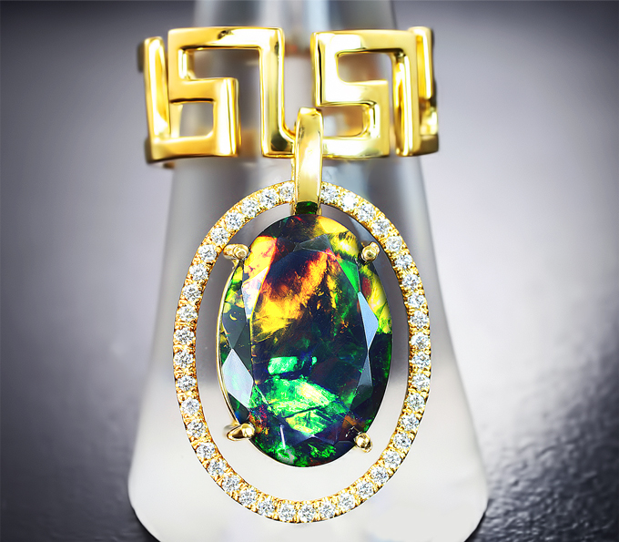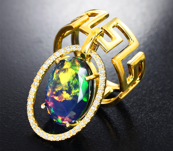 Кольцо с ограненным черным опалом 3,58 карата и бриллиантами