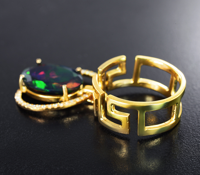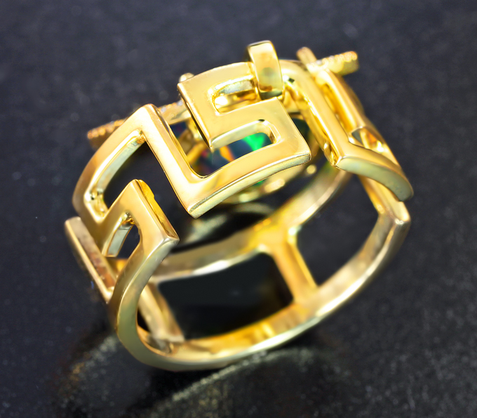 Вашему вниманию предлагается кольцо из стерлингового серебра (925 проба) c ограненным черным опалом и бриллиантами! Изделие позолочено. Основные цвета опалесценции: красный, желтый, зеленый и синий. Диаметр дополнительной инкрустации 1,1 мм. Ширина площадки 30 мм, высота 5 мм. Вес изделия 5,71 г. Размер 17. Ниже приводятся ювелирные характеристики опала.