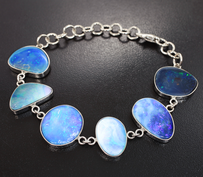 Вашему вниманию предлагается браслет из белого золота 585 пробы с австралийскими дублет опалами! Основные цвета опалесценции - синий и фиолетовый. Длина браслета от 155 мм до 195 мм, ширина 20 мм. Вес изделия 17,2 г. Ниже приводятся ювелирные характеристики.