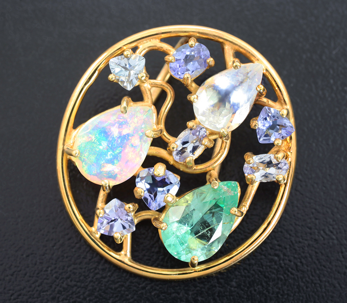 Кулон с «неоновым» уральским изумрудом 1,76 карата, ограненным эфиопским опалом 1,26 карата, лунным камнем 1,22 карата и танзанитами 1,67 карата