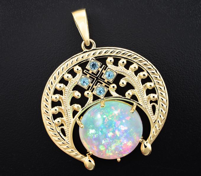 Вашему вниманию предлагается кулон из желтого золота 585 пробы с кристаллическим эфиопским опалом и голубыми топазами! Основные цвета опалесценции: красный, желтый, зеленый, синий и фиолетовый. Диаметр дополнительной инкрустации 2 мм. Размеры кулона с петлей 47 х 37 мм. Вес изделия 12,25 г. Ниже приводятся ювелирные характеристики опала.