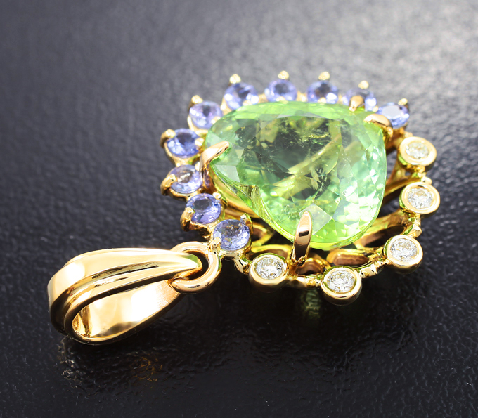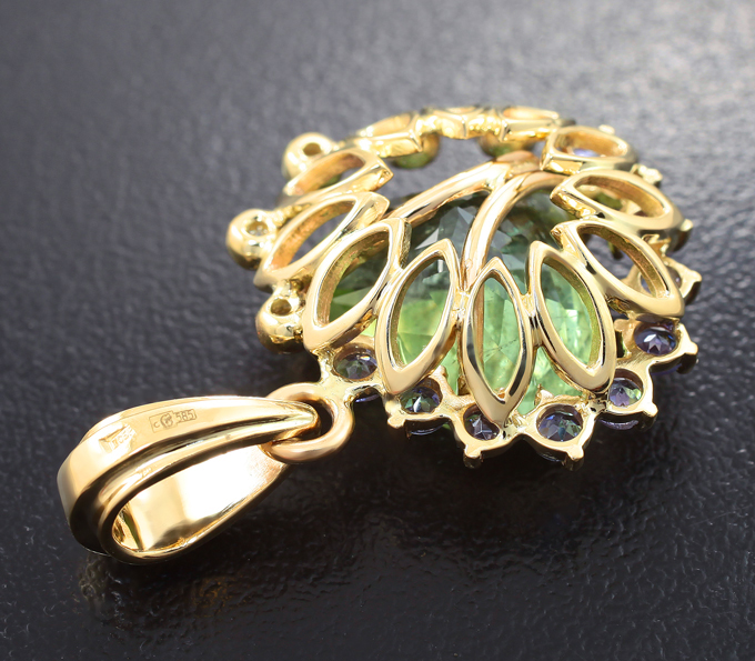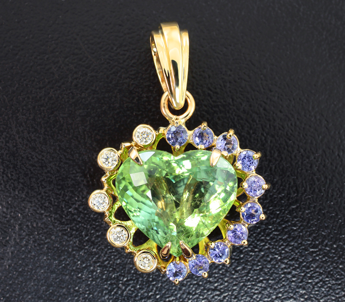 Кулон с зеленым турмалином 9,07 карата, танзанитами и бриллиантами