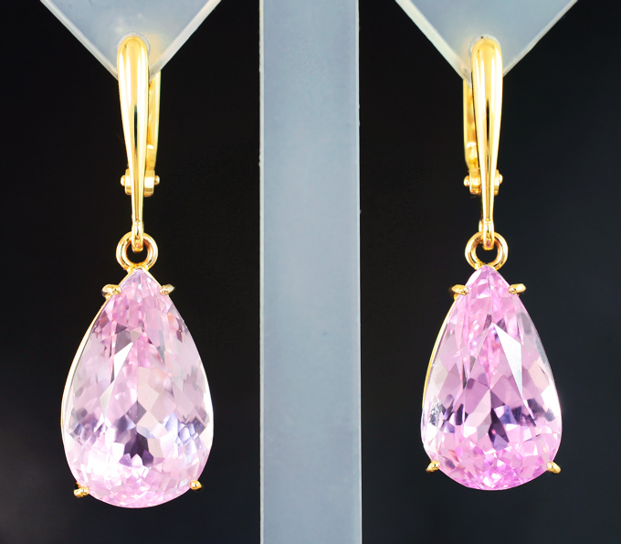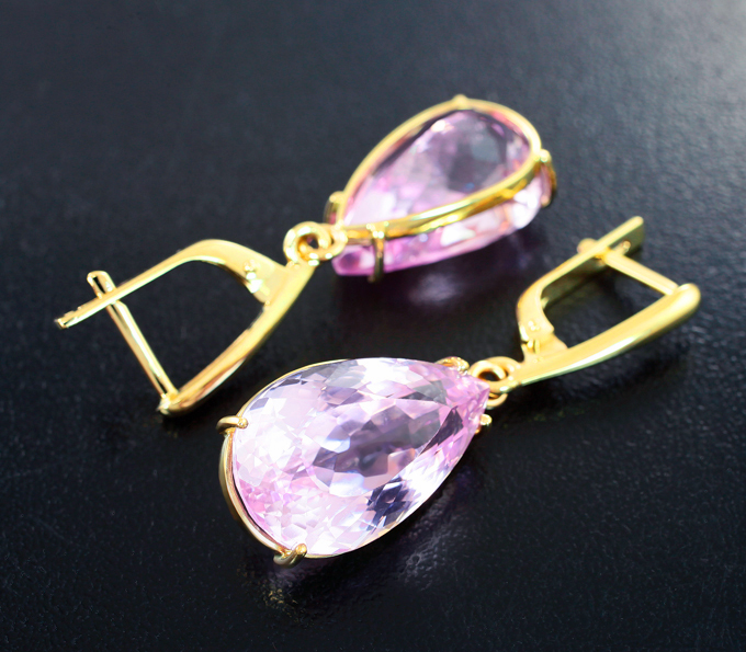Вашему вниманию предлагаются серьги из желтого золота 585 пробы с крупными кунцитами! Размеры серег с петлей 37 х 12 мм. Вес пары 8,86 г. Ниже приводятся ювелирные характеристики вставок.