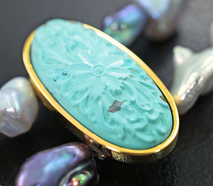 Браслет с резным кабошоном армянской бирюзы 5,76 карата и разноцветным жемчугом