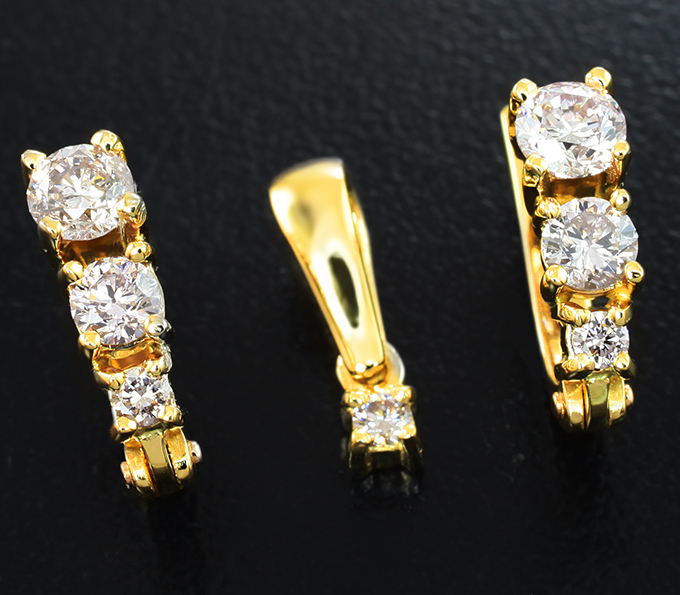 Вашему вниманию предлагается комплект (серьги + кулон) из желтого золота 585 пробы с бриллиантами! Вес комплекта 2,98 г.