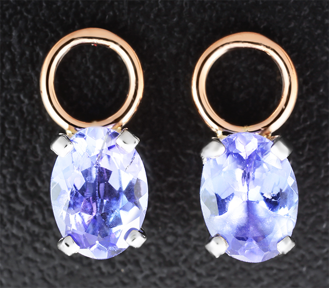 Вашему вниманию предлагаются подвесы для серег из красного и белого золота 585 пробы с танзанитами! Размеры изделия 12 х 6 мм. Вес пары 1,36 г. Ниже приводятся ювелирные характеристики вставок.