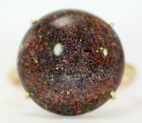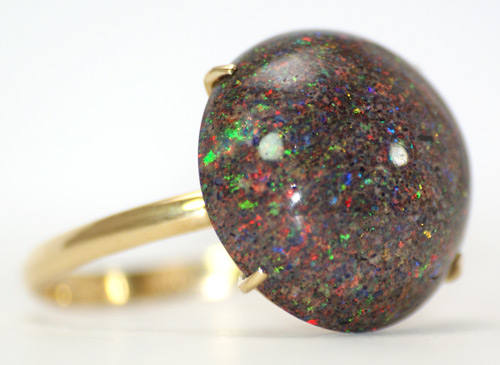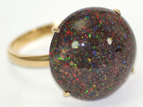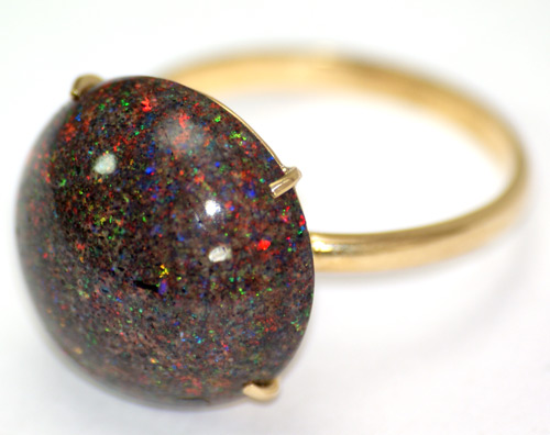 Кольцо из желтого 18-каратного золота (750 проба) с драгоценным черным опалом весом 10,28 карата. Высота площадки 8,8 мм, ширина 16,5 мм. Вес изделия 6,5 г. Размер 18,5.