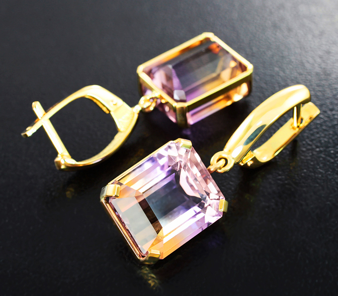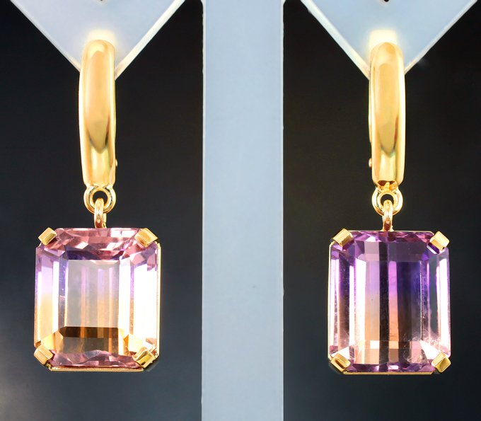 Вашему вниманию предлагаются серьги из желтого золота 585 пробы с аметринами! Размеры серег с петлей 32 х 11 мм. Вес пары 8,87 г. Ниже приводятся ювелирные характеристики вставок.