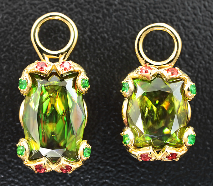 Серьги со сфенами авторской огранки 4,79 карата, красными сапфирами и цаворитами