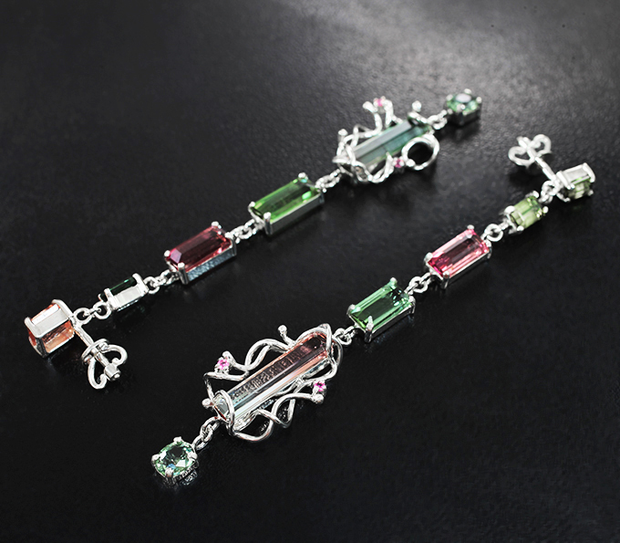 Вашему вниманию предлагаются серьги из стерлингового серебра (925 проба) с разноцветными турмалинами, зелеными и оранжевыми сапфирами! Диаметр дополнительной инкрустации 1,5 мм. Площадка серег 85 х 15 мм. Вес пары 10,15 г. Ниже приводятся ювелирные характеристики вставок.
