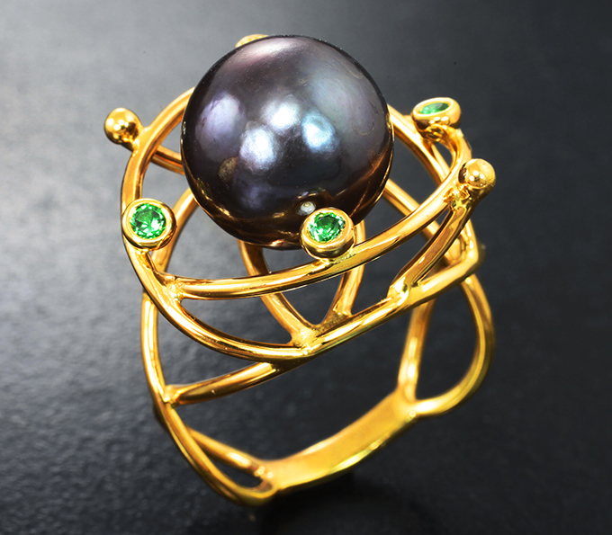 Вашему вниманию предлагается кольцо из стерлингового серебра (925 проба) c цветной морской жемчужиной барокко и цаворитами гранатами! Изделие позолочено. Диаметр дополнительной инкрустации 2 мм. Площадка 21 х 19 мм, высота 14 мм. Вес изделия 5,82 г. Размер 18. Ниже приводятся ювелирные характеристики жемчужины.