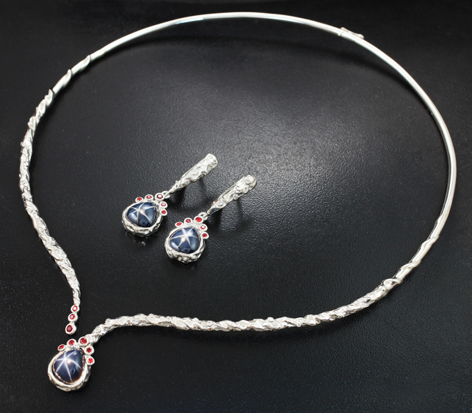 Комплект со звездчатыми сапфирами 21,5 карата, красными сапфирами и бесцветными цирконами