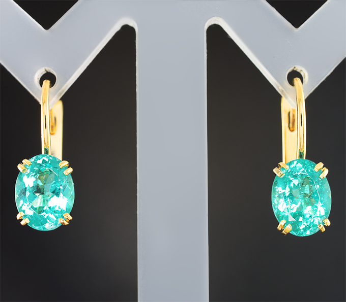 Вашему вниманию предлагаются серьги из желтого золота 585 пробы с «неоновыми» апатитами! Размеры серег с петлей 18 х 6 мм. Вес пары 2,75 г. Ниже приводятся ювелирные характеристики вставок.