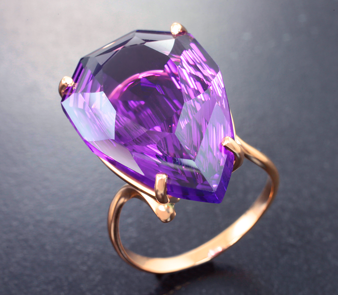 Вашему вниманию предлагается кольцо из красного золота 585 пробы c аметистом авторской огранки! Площадка 25 х 16 мм, высота 11 мм. Вес изделия 7,42 г. Размер 18,5. Ниже приводятся ювелирные характеристики вставки.