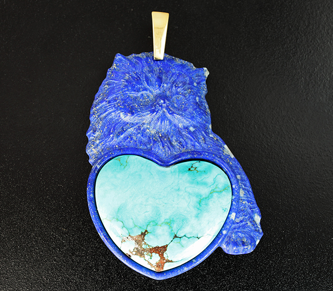 Камея-подвеска «Котофей» из цельного амазонита в резном лазурите
